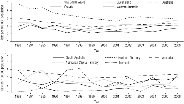 Per capita rates of HIV diagnosis per 100 000 population, directly standardised to the national population in 10-year age groups, were calculated by state/territory and year using Australian Bureau of Statistics mid-year population estimates.4,5 For diagnoses associated with male-to-male sex, rates per 100 000 male population were also calculated by state/territory. The proportions of the national population reported as Indigenous or overseas-born were obtained from 2001 census data.6,7 Cases newly diagnosed in Australia were analysed by Indigenous status for 1993–2006; in the Australian Capital Territory and Victoria, where routine reporting of Indigenous status at HIV diagnosis began in January 2005 and June 1998, respectively, cases diagnosed since these dates were included.2 Analyses by country of birth were limited to cases newly diagnosed in Australia from 2002, when reporting of country of birth was introduced nationally.
