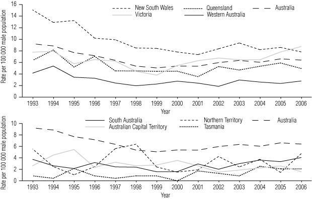 The per capita rate of diagnosis associated with male-to-male sex (per 100 000 male population) in 1993–2006 was 6.5, with the highest rate reported in NSW (9.6), followed by Victoria (6.5) and Queensland (5.3). Similar to the overall per capita rate, there was a significant downward trend in this rate until around 2000; rates then increased in Victoria, Queensland, WA and SA from 2001 onwards, but the trend was only significant in Victoria. By 2006, the rate in Victoria had surpassed NSW (8.7 v 7.8 per 100 000 male population; Box 2).
