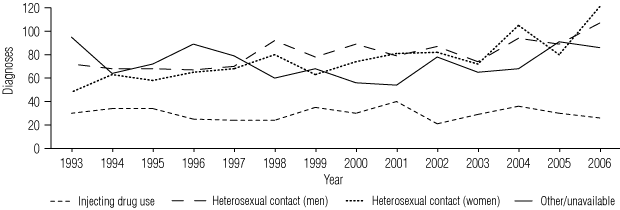 In diagnoses not associated with male-to-male sex, a history of injecting drug use was reported in 416 cases (269 with a history of heterosexual contact and 147 with no sexual exposure history specified), representing 3.4% of the total number of diagnoses in the study period. There was little change in the proportion of diagnoses in this category over time.