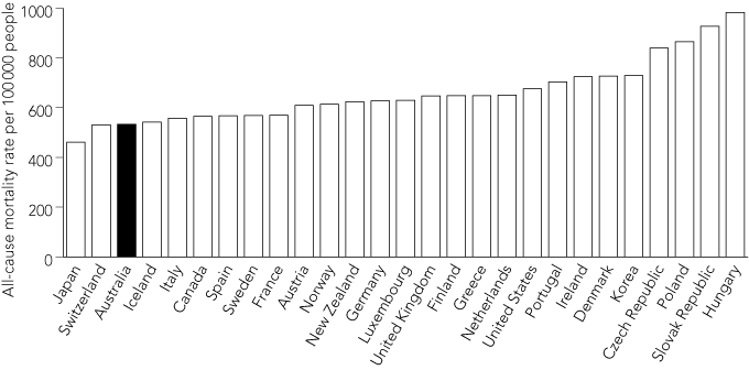By the beginning of the 21st century, Australia had leapfrogged a group of developed countries — including Sweden, France, Italy, Iceland, Canada and Spain — to rival Switzerland for second ranking behind Japan on all-cause mortality rates (Box 1).1 Closely related to these are our rankings on total life expectancy and healthy life expectancy at birth,2 which are also among the best in the world.