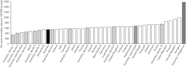 Results: Latest data from Organisation for Economic Cooperation and Development (OECD) countries confirm that, while Japan’s death rates remain the lowest in the world, Australia’s are decreasing rapidly and we now rival Switzerland for second overall ranking. When the contributions of specific conditions are compared, the areas with the greatest potential for reductions are circulatory diseases (especially ischaemic heart disease); suicide; injury and violence; smoking-related conditions; and cancers amenable to prevention/early detection. Intranational comparisons show considerable scope for reduction in inequalities, especially those between Aboriginal and Torres Strait Islander peoples and other Australians, between males and females, and between low and high socioeconomic groups. These conditions and inequalities are highly interrelated, as differentials in health status are often mediated through broader societal inequalities.
