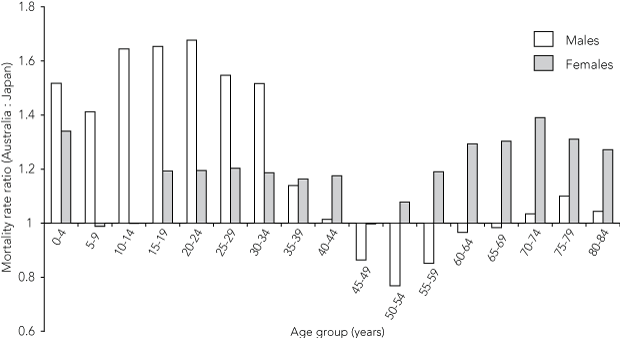 Age-specific comparisons with Japan (Box 5) show higher mortality rates for Australians at virtually every age, with the exception of men in their middle years.