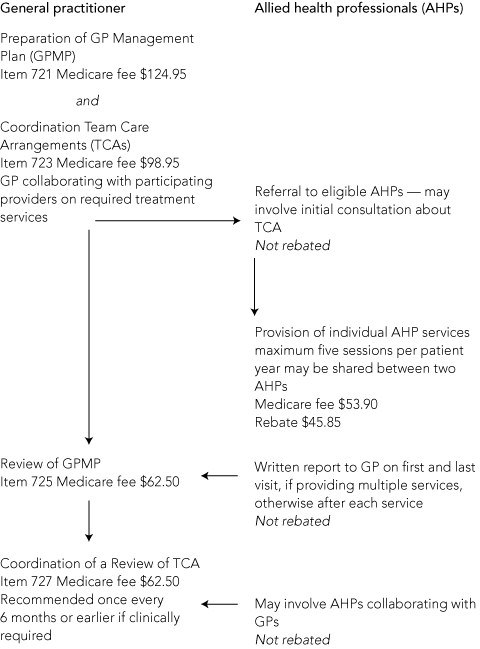 Effective chronic care relies on delivery systems that support continuous and quality interactions with the care team, tailored care according to need, and cooperation among care providers.5 Support by non-medical providers for self-management and behaviour change, and continuous follow-up to assess clinical improvement and self-management competence are also important.6 The restriction to five sessions per year suggests an emphasis on assessment and brief intervention rather than the sophisticated mix of care advocated for effective chronic care. Team Care Arrangements (TCAs) require that the GP and at least two other health professionals must take part in the care of the patient.3 If both of these other professionals are private AHPs, they have to share the five sessions. The GP determines how the sessions are apportioned.