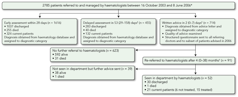 The diagnostic categories for patients in each management group are presented in Box 2. All patients referred with aggressive presentations, such as acute leukaemia, were managed with early assessment. The most frequent diagnostic category, “thrombosis-related” (34%; 949/2785), largely represented patients who had presented to hospital with venous thromboembolic disease and been discharged for early-stage anticoagulation therapy. Some patients (6%; 164/2785) who had early or delayed assessment were found to have no haematological diagnosis.