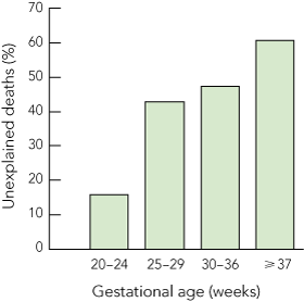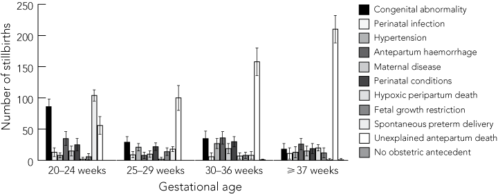 The most common causes of death differed by gestational age group, and are shown in Box 3. For extremely preterm stillbirths at 20–24 weeks’ gestation, the most common classification was spontaneous preterm delivery, whereas for stillbirths at 37 or more weeks’ gestation, unexplained antepartum death was the most common classification.