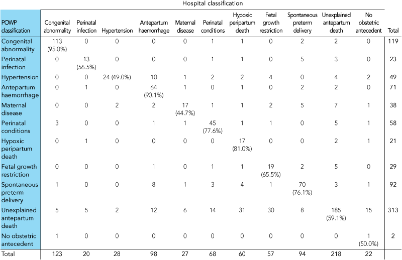 Main outcome measures: Pattern of stillbirths by cause and gestation period; and interobserver agreement on classification of cause of death (according to the PSANZ-PDC) between local hospital review committees and the POWP.