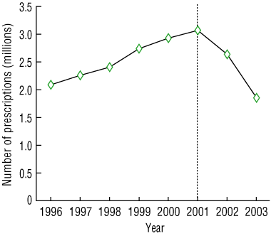The number of HRT prescriptions among concession cardholders increased from 2 089 834 in 1996 to 3 070 299 in 2001, and then dropped by 40% to 1 854 060 in 2003 (Box 1). Declines of similar magnitude from 2001 to 2003 were observed in prescriptions for oestrogen-only preparations (39% decline), combined oestrogen–progestogen preparations (41% decline), and if prescriptions captured under the Medicare Safety Net scheme were excluded (40% decline).