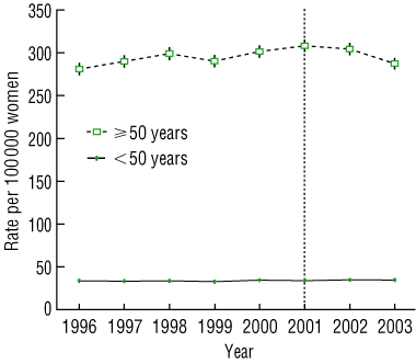 However, among women aged ≥ 50 years, the age-standardised incidence of breast cancer per 100 000 women increased from 281.1 in 1996 to 308.3 in 2001, and then decreased to 287.4 in 2003 (Box 2). From 2001 to 2003, age-standardised incidence rates in this age group fell by 6.7% (95% CI, 3.9%–9.3%; P < 0.001), equivalent to 600 fewer breast cancers (95% CI, 350–830) in women aged ≥ 50 years in 2003 compared with 2001.