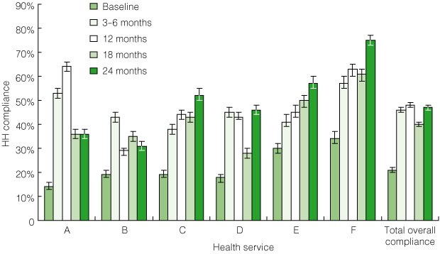 Overall, HH compliance increased significantly during the study period, from a mean of 21% (95% CI, 20%–22%) at baseline to 47% (95% CI, 46%–48%; range, 31%–75%) at the final assessment (P < 0.001) (Box 1). After an initial increase in HH compliance, three sites (A, B and D) showed some transient declines in compliance rates. In each case, these were related to changes in project officers. Sites with unchanged project officers experienced the most robust and sustained improvement in HH compliance. The type of ABHRS used did not influence the rates of HH compliance achieved or their sustainability.