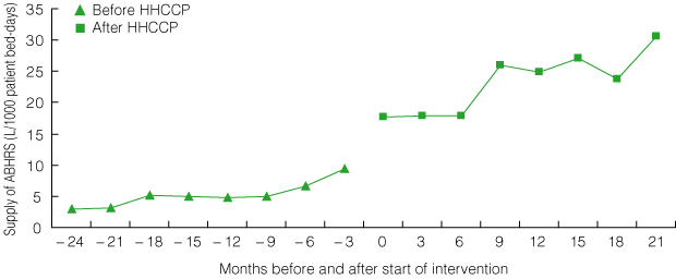 ABHRS supply increased from a mean of 5.3 L/1000 bed-days during the 24-month pre-intervention period to a mean of 27.6 L/1000 bed-days in the final 6 months of the project, but correlated poorly with HH compliance rates, owing to marked variations in supply ordering patterns and stockpiling (Box 2).