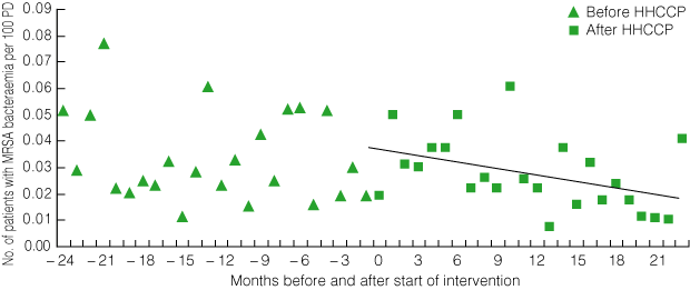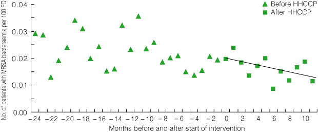 Overall, the number of patients with MRSA bacteraemia fell from a mean baseline rate of 0.03/100 PD per month to 0.01/100 PD per month 12 months after the start of the intervention (P = 0.09 for trend) (Box 8).