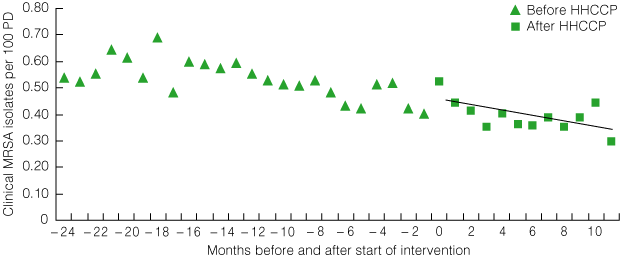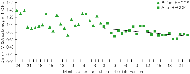 The total number of clinical MRSA isolates per month fell significantly from a mean baseline rate of 0.54 per 100 PD to 0.30 per 100 PD 12 months after the start of the intervention (P = 0.043 for trend) (Box 9). Notably, the rate of clinical MRSA isolates was declining significantly statewide before the HHCCP (P = 0.0003 for trend), and this decline continued with introduction of the HHCCP.