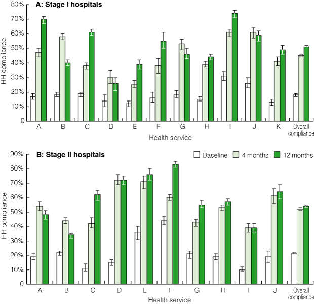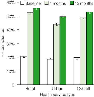 Overall, HH compliance increased significantly during the study period, from a mean rate of 20% (95% CI, 19%–20%; range, 10%–44%) at baseline to 49% (95% CI, 48%–49%; range, 25%–72%) after 4 months, to 53% (95% CI, 52%–53%; range, 26%–83%) after 11–12 months (P < 0.001 for each comparison) (Box 6). Results for Stage I and Stage II hospitals were similar (Box 7). Large rural sites demonstrated the most dramatic results: five health services achieved HH compliance rates of > 70%, with one of these achieving 83% compliance.