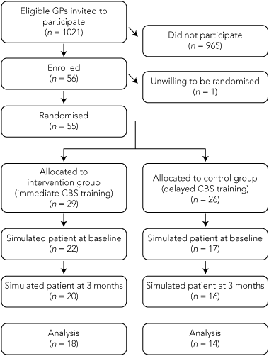 Design: Randomised controlled trial, with baseline and post-training measurement of GP competency in CBS using standardised simulated patient consultations, conducted between January 2005 and December 2006.