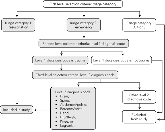 The before-ViCCU (BV) and after-ViCCU (AV) patient samples consisted of acutely ill patients requiring urgent care, defined as those triaged to category 1 (resuscitation) or specified subcategories of triage category 2 (emergency) (Box 3).8 We calculated that we would need a sample size of 192 presentations (5% significance and 80% power), assuming a 12.5% decrease in hospital admissions after the introduction of the ViCCU. This meant that 12 months of BV and 18 months of AV data were required.