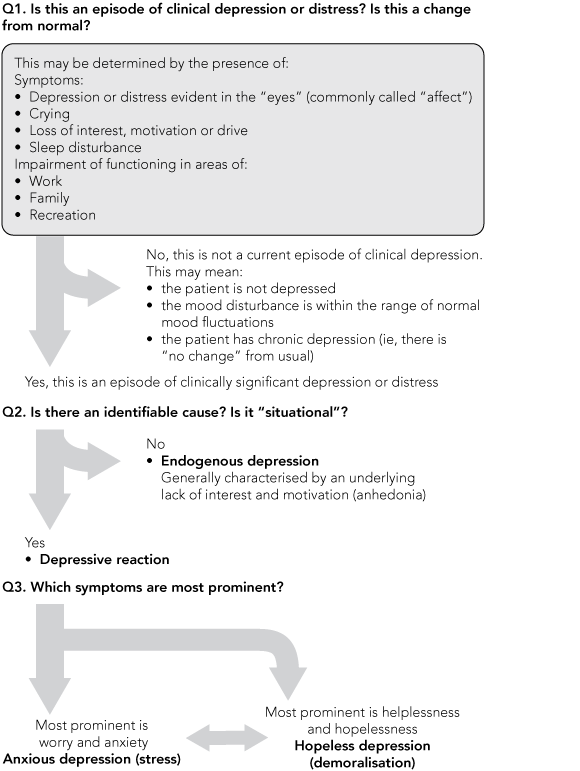 Results: GPs consider distress and depression in three steps. In the first step, a change in a group of symptoms and signs is observed (eg, facial expression, loss of drive). The second step categorises the syndrome according to whether or not there is an identifiable environmental cause (reactive or “endogenous”), with the final step categorising the reactive syndromes according to their most prominent symptoms: either anxiety and worry, or helplessness and hopelessness. The resulting taxonomy includes: endogenous depression (a chronic and perhaps characterological depression characterised by a lack of interest and motivation); anxious depressive reaction (stress or worry); and hopeless depressive reaction (demoralisation).
