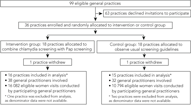 Intervention: Doctors in the intervention practices were asked to routinely offer combined chlamydia and Pap screening to eligible women; doctors in the control practices were asked to implement screening guidelines based on a risk assessment of the individual patient (ie, usual practice).