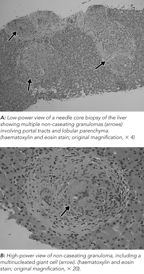 Granulomatous hepatitis is an uncommon condition with a lengthy list of possible causes,1 as shown in Box 1. In our patient, the biopsy did not show bile duct destruction characteristic of primary biliary cirrhosis, or any evidence of malignancy. The patient was not taking any drugs which could cause granulomatous hepatitis. The pathology laboratory report suggested the diagnosis was sarcoidosis, and, of the infections that can cause granulomatous hepatitis, tuberculosis (TB) is the most common. Hence, although the differential diagnosis is long, the main clinical decision related to the ability to diagnose or exclude TB. If a patient with hepatic TB has corticosteroid therapy for erroneously diagnosed sarcoidosis, the consequences may be catastrophic. Active TB most typically presents with pulmonary symptoms, and the diagnosis can usually be made provided smears and cultures for mycobacteria are obtained. However, if a patient presents more atypically, as did our patient, clinicians may initially not suspect TB as the diagnosis.2