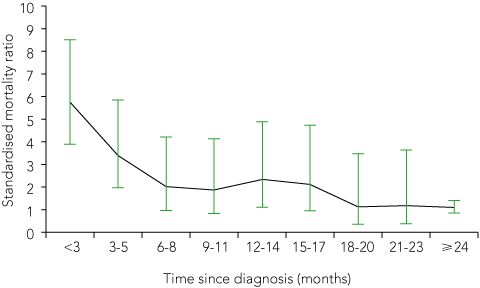 Other population studies that have investigated the suicide rate after cancer diagnoses have all found a high SMR in the first year, but the study intervals varied from months to years.1,2,7,8,12 Our standardised choice of 3-monthly intervals in the first 2 years after diagnosis identified (for the first time) a second peak at 12–14 months. (Box 4). We postulate that this second peak may be due to recurrence of disease, occurrence of metastases, or the failure of treatment. Two earlier studies suggested that a peak may have occurred at 8–10 months,7,12 but this would have required further statistical analysis for confirmation. The second peak occurs a little later in our study, possibly due to improvements in cancer treatments delaying recurrence.
