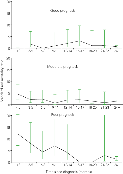 The SMR was lowest in the good prognosis group (0.86; 95% CI, 0.59–1.27), higher in the moderate prognosis group (1.67; 95% CI, 1.31–2.14), and highest in the poor prognosis group (3.39; 95% CI, 2.47–4.64). Rates for the three cancer prognosis groups over time since diagnosis are plotted in Box 5. The highest SMR of 12.07 (95% CI, 7.15–20.38) was observed in the poor prognosis group in the first 3 months after diagnosis. The moderate prognosis group had an initial elevated SMR of 4.43 (95% CI, 2.31–8.52), which dropped and then rose again to 2.09 at 15–17 months. The good prognosis group had an initial SMR of 1.73 (95% CI, 0.43–6.91), which dropped to zero before peaking at 3.11 (95% CI, 1.00–9.63) at 15–17 months after diagnosis.
