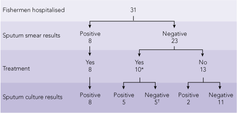 Our finding that all 117 spot sputum tests were smear-negative and culture-negative for TB is more difficult to interpret. Although no cases of pulmonary TB were later diagnosed in fishermen cleared by the health assessment process, the yield of a single sputum sample is low.12 To ensure that screening is maximising case detection, it may be that spot sputum tests should be replaced with three samples. As it has low infectivity, we did not screen for extra-pulmonary TB. The total burden of TB in illegal fishermen will therefore have been underestimated by our study.