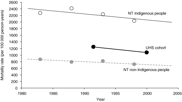 2 All-cause mortality in the Northern Territory since 1980 for Indigenous and non-Indigenous people aged ≥ 25 years8 and the Urapuntja Health Service (UHS) cohort10