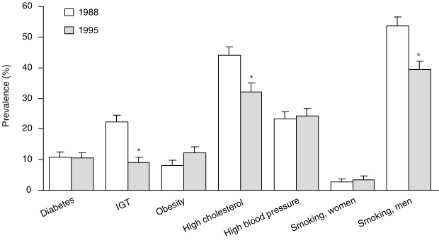 For the 8 years before the commencement of the cohort study, there were no significant changes in the prevalence of obesity (P = 0.125), diabetes (P = 0.907), hypertension (P = 0.983) or, for women, smoking (P = 0.931) (Box 3). There were significant reductions in the prevalence of impaired glucose tolerance (P < 0.001), hypercholesterolaemia (P = 0.003) and smoking among men (P = 0.034).