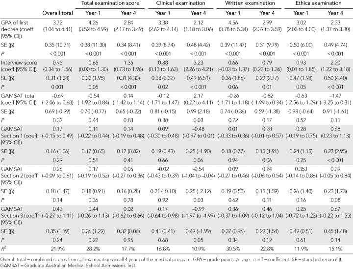 Results: Selection criteria explained 21.9% of variation in overall total score, falling from 28.2% in Year 1 to 17.7% in Year 4. This was highest for the written examination in Year 1 (30.5%) and lowest for the clinical examination in Year 4 (10.9%). GPA was most strongly correlated with academic performance (eg, for overall score, partial Spearman’s correlation coefficient [pSCC], 0.47; P < 0.001), followed by interviews (pSCC, 0.12; P = 0.004) and GAMSAT (pSCC, 0.07; P = 0.08). The association between GPA and performance waned from Year 1 to Year 4, while the association between interview score and performance increased from Year 1 to Year 4.