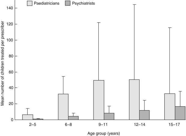 The mean number of children treated per paediatrician was skewed (skewness coefficient, 5.2), with a mean of 159.8 and a median of 82 (range, 1–1977). The mean number of children treated per psychiatrist was smaller (34.3) and less skewed (skewness coefficient, 1.8; median, 15; range, 1–166). Compared with psychiatrists, paediatricians treated an average of 4.3–7.1 times more children between the ages of 2 and 14 years, after which differences between specialties declined (Box 1). A greater within-specialty variation in psychostimulant prescribing was observed for paediatricians compared with psychiatrists (Box 1).