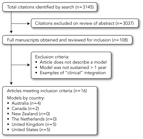 Our review identified studies published between 1990 and 2006 that described and evaluated models of integrated governance for health care delivery. We included studies describing a sharing of management and funding delivery services across two or more health care institutions. To ensure that the research was only informed by studies involving governance frameworks that were sustainable in the longer term, we excluded studies that had been sustained for less than 12 months.