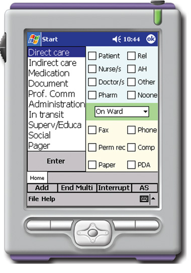 A multidimensional work task classification system was designed and incorporated into a handheld computer (a personal digital assistant).10,11 Pilot testing occurred at the study site, with 7 hours’ observation and review by seven doctors. On the basis of feedback, three subtask categories were added — searching for x-rays, searching for missing medical records and writing discharge summaries — which doctors reported consumed “all our time” or “wasted” their time. A category to identify interruptions by a pager was also added.