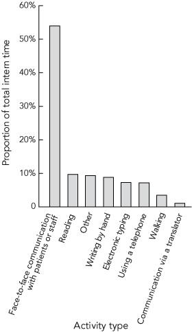 Activity types: Face-to-face communication with patients or staff accounted for more than half of total intern time (39% percent of time was face-to-face communication with patients); 16% of time was spent writing or typing, and 7% was spent on the phone (Box 4).