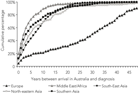 European patients in the study population have been arriving in Australia since the 1940s, when Europeans represented the majority of Australia’s immigrants (Box 3). By contrast, patients from other migrant groups have been arriving mostly since the 1970s or 1980s, when immigration policies changed in Australia. To determine whether these changes in immigration may explain the pattern of diagnosis for European migrants, we compared time between arrival and diagnosis for migrants by region of birth for the total study population (Box 2), and for only those migrants who arrived in Australia after 1980 (Box 4). Only 21% of European migrants in the total study population were diagnosed within a decade of arrival, compared with 73% of all other migrant groups combined (P < 0.001) (Box 2). However, of migrants arriving in Australia after 1980, 68% of Europeans were diagnosed within a decade of arrival, similar to the proportion of all other groups (76%) (P = 0.151) (Box 4).