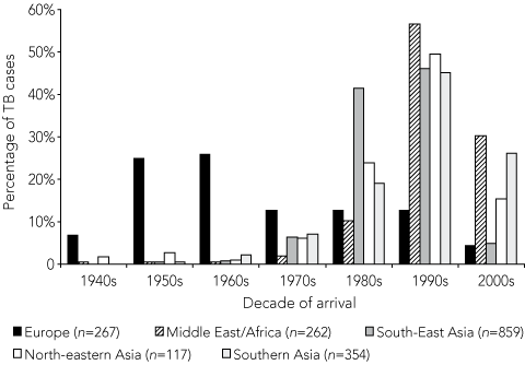 Logistic regression analysis indicated that, compared with migrants from South-East Asia (the largest group of migrants), migrants diagnosed 10 or more years after arrival were more likely to be diagnosed during 2000–2004, to be aged ≥ 35 years (with the risk increasing with age), and to be born in Europe. They were less likely to have been born in the Middle East/Africa, north-eastern Asia or southern Asia. There was no association between years to diagnosis and sex, site of infection or drug resistance (Box 1).