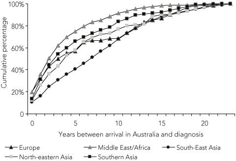 2 Cumulative percentage of years between arrival in Australia and diagnosis of tuberculosis, by region of birth for all migrants (n = 1924)