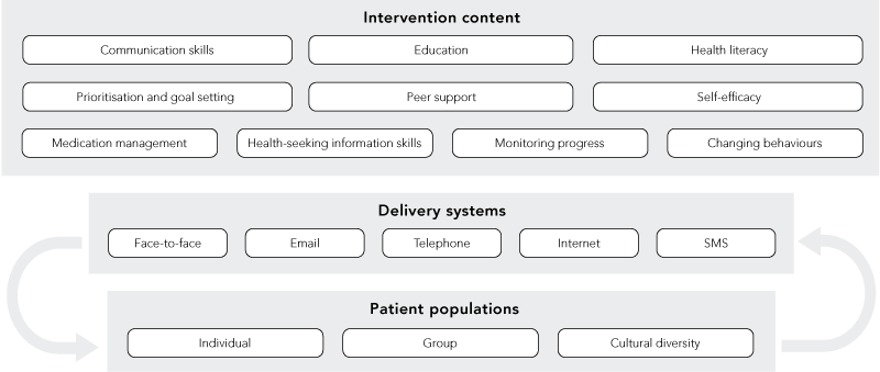 In addition to self-management support, additional chronic disease management components are required to support health care professionals to apply best practice, thereby helping patients manage all aspects of their condition in relation to their daily lives.31