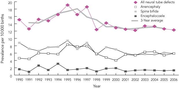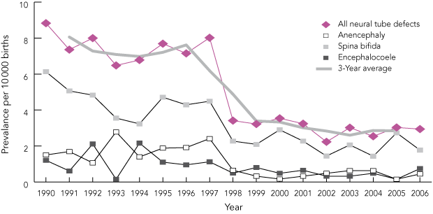 The most striking finding is the decrease in the prevalence of NTD-affected pregnancies from about 17 to 14 per 10 000 births from 1997 to 1999, coinciding with the introduction of voluntary folate fortification of foods and an awareness campaign. The 3-year moving average was used as a conservative estimate of the effect, taking into account annual fluctuations due to small numbers. Also, it is likely that the impact of voluntary fortification and the campaign would gradually have filtered through to the population over several years, rather than having a sudden effect. The total prevalence of pregnancies affected by NTDs has not decreased further since 1999; rather, the prevalence fluctuates around 13 per 10 000 births. The lack of further decline probably reflects the continuing passive, non-increasing uptake of fortified foods in the absence of a sustained folate-awareness strategy. The apparent increase in NTD prevalence in the 1990s is likely to be the specifically result of increased prenatal detection and notification of anencephalic pregnancies, given that the prevalence of spina bifida or encephalocoele remained fairly constant in the same period (Box 2). The rate of termination for pregnancies affected by NTDs has increased, and there were almost 500 pregnancies terminated because of an NTD during our 9-year study period.