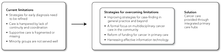 As members of a multidisciplinary team, we would like to propose a number of strategies for meeting the cancer challenge. We do not claim the ideas as novel, but they have seldom been framed for debate in this way. We also acknowledge that the issues are complex, there may be gaps in the evidence base, and some of the innovations we propose may require further evaluation and policy debate. We highlight four specific challenges in caring for people with cancer and propose four strategies for overcoming existing limitations, all of which may be addressed in an integrated primary care hub (Box 1).