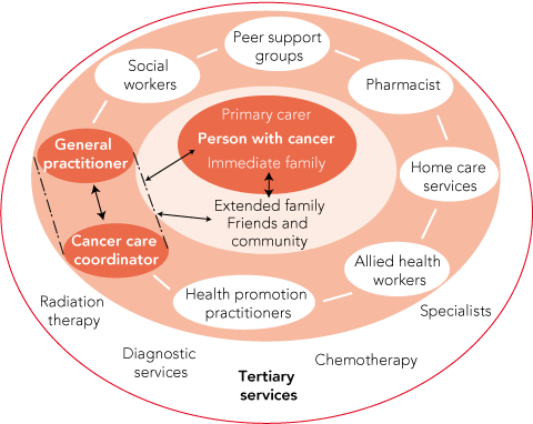 A possible remodelling of health care for people with cancer, and potentially other chronic conditions, is summarised in Box 3. The acute phase of cancer treatment would continue to be managed by specialists, given the need to apply costly, technologically intensive and scarce treatment modalities. However, primary care providers could have more contact with patients during the active treatment phase. We argue that greater involvement of professionals in the community, functioning within a care hub, could offer better practical and psychosocial support than patients receive under the present system. At the centre of the hub would be the patient, his or her carer, and wider family. Within the hub, the GP would remain closely involved, but after diagnosis, the support and coordination role could also be undertaken by another health professional acting as the patient’s advocate and with the authority to harness input from a range of paramedical, social and welfare agencies.