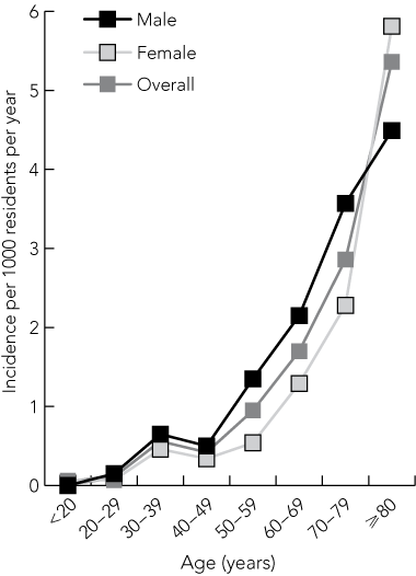 There was only one case of VTE among patients aged < 20 years; in this age group, the annual incidence was 0.03 (95% CI, 0–0.09) per 1000 residents. Among patients aged ≥ 80 years, the annual incidence was 5.36 (95% CI, 3.59–7.13) per 1000 residents (Box 3).