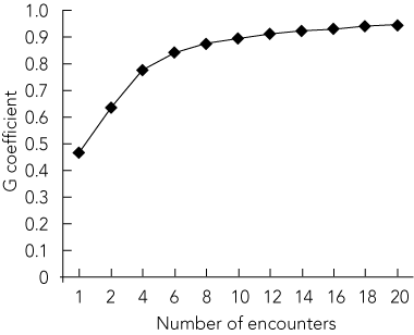 We used a G study followed by a D study to evaluate the reliability of the measurement, and sought to determine the number of observed clinical encounters needed to attain a G coefficient of 0.90. This value was set by taking into account the high stakes of the assessment for the IMGs. The average rating for the different assessments within each encounter (eg, history taking, examination) was the outcome measure for these analyses. As each IMG interacted with different patients and a different number of patients, the “patient-encounters” factor was treated as nested within IMGs in the G-study design.