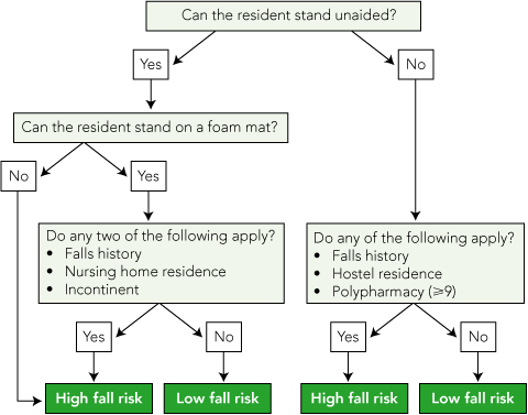 Results: Ability to stand unaided was identified as a significant event modifier for falls. In people who could stand unaided, having either poor balance or two of three other risk factors (previous falls, nursing home residence, and urinary incontinence) increased the risk of falling in the next 6 months threefold (sensitivity, 73%; specificity, 55%). In people who could not stand unaided, having any one of three risk factors (previous falls, hostel residence, and using nine or more medications) increased the risk of falling twofold (sensitivity, 87%; specificity, 29%).