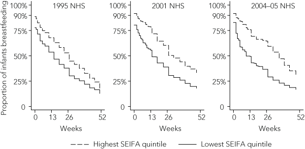 2 Breastfeeding duration: weighted estimates of proportions of infants breastfeeding at 0–52 weeks in the 1995, 2001 and 2004–05 National Health Surveys (NHSs) in the lowest and highest SEIFA quintiles*