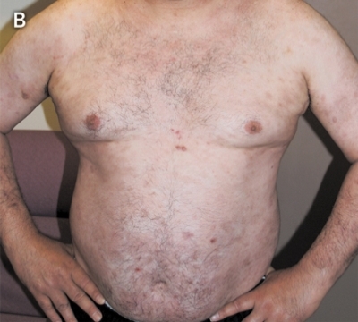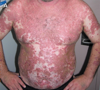 A 44-year-old Samoan man presented in 2004 with a blistering skin rash affecting his face, trunk and upper limbs (Figure, A). There was no mucosal involvement and a positive Nikolsky sign (the production of a blistering lesion on applying pressure to non-affected skin) was demonstrated. Skin biopsy revealed acantholysis and cleft formation within the superficial layers of the epidermis, confirming a diagnosis of pemphigus foliaceus. Direct immunofluorescence testing of a perilesional skin biopsy specimen revealed deposition of IgG and C3 in the intercellular cement substance of all layers of the epidermis. Indirect immunofluorescence testing, using a monkey oesophagus substrate, demonstrated a high titre of autoantibodies in the patient’s serum.