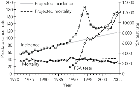 Projected incidence of prostate cancer (Box 1) remained substantially below the observed incidence from 1989 to 2005. We estimate that 19 602 extra men were diagnosed with prostate cancer, or about 43% more cases than were expected.