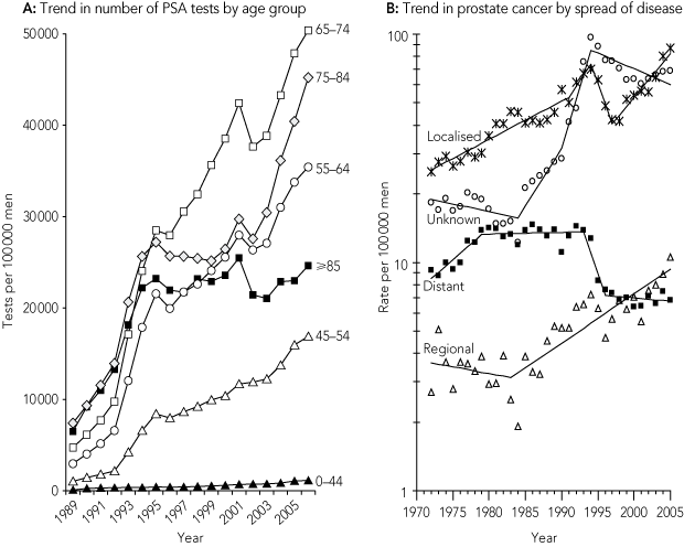 The relative increase in incidence rates was greatest in younger men: rates in those aged 45–54 years increased more than sevenfold from 7.5 per 100 000 men in 1982–1986 to 60.0 per 100 000 men in 2002–2005 (Box 3, A). Increases were first evident in 1988 in the oldest men, then in men aged 45–74 in 1991, which largely mirrored the initial uptake of PSA testing by age group (Box 2, A), with more tests occurring in older age groups between 1989 and 1993. Coinciding with PSA testing becoming available, the median age at which men were diagnosed with prostate cancer fell from 72 years in 1982–1986 to 69 years in 2005.