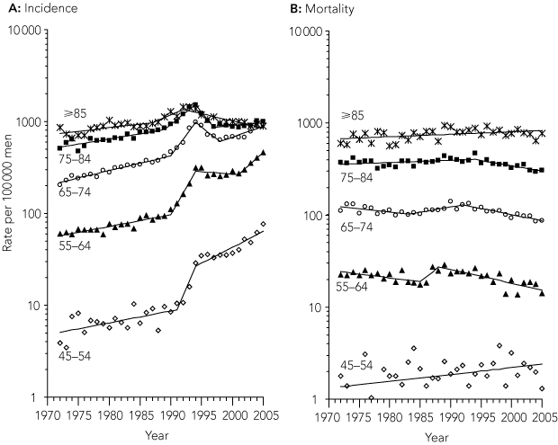Main outcome measures: Age-standardised and age-specific rates and joinpoint regression to identify changes in trends; projected trends observed before the introduction of PSA testing to quantify its impact on incidence and mortality rates.