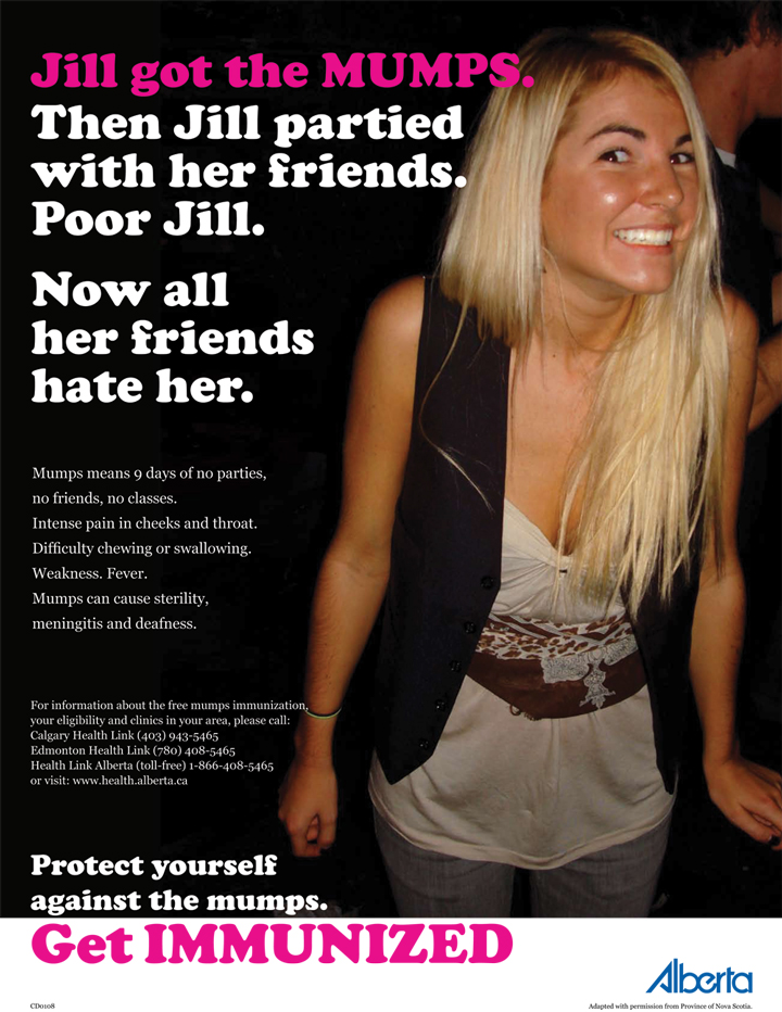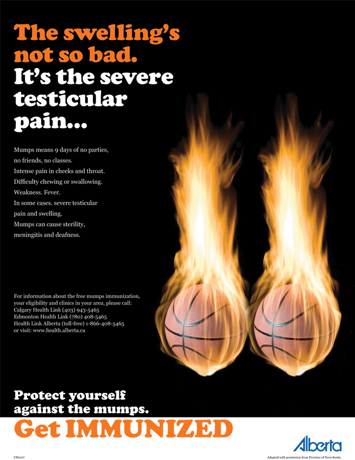 Before the introduction of mass vaccination programs, mumps primarily affected 5–9-year-old children, but more recent (and large) outbreaks have mainly affected adolescents and adults.5,6 In 2004–2005 in the United Kingdom, more than 56 000 clinical cases of mumps were notified, with the majority of confirmed cases occurring in 15–24-year-olds.7 This change is clinically important, as mumps tends to be more severe in adolescents and adults than in children.8 Furthermore, some complications such as orchitis are limited to post-pubertal infection. Posters produced for mumps education campaigns in response to large Canadian outbreaks that also affected many adolescents and adults (http://www.health.alberta.ca/public/disease_conditions.html#mumps) are shown in Box 1.