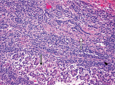 At 59 years of age, a laparotomy was performed and the patient was found to have a large left adnexal mass (Box 1, A) and a normally formed uterus. The mass was removed and a subtotal hysterectomy performed as there was no distinct lower margin of the cervix (Box 1, B). The patient was informed of the operative findings and the diagnosis of intersex. Peripheral blood karyotyping showed a 46,XY genotype. The histopathology of the gonadal tumour showed a sex cord-stromal tumour of indeterminate differentiation (Box 2). The histopathology of the uterus showed simple endometrial hyperplasia. The patient was treated with postoperative chemotherapy, but died 18 months later.