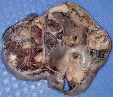 A 59-year-old man presented with haematuria and gynaecomastia, and was subsequently found to have a large pelvic mass. Examination of his left breast identified a 3–4 cm mobile mass. Ultrasonography of the breast confirmed a mass, but could not distinguish between glandular tissue and a breast tumour. Computed tomography (CT) of the abdomen and pelvis showed a 10 cm complex pelvic mass that was thought to extend to the seminal vesicles. A core biopsy showed mixed cytological and immunohistochemical features of a possible granulosa cell tumour, but the precise diagnosis was limited by the small amount of material present for examination. A provisional diagnosis of gonadal malignancy in a dysgenetic gonad was considered.